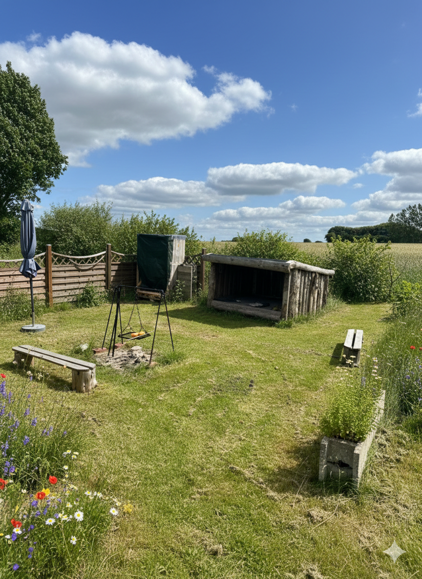 Vi har en stor græsplæne til fysiske aktiviteter samt et shelter i baghaven til udflugter og overnatninger.